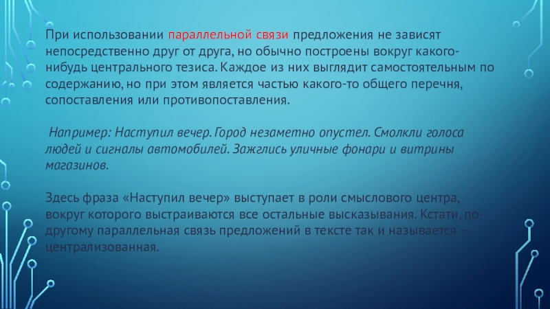 Здесь фраза «Наступил вечер» выступает в роли смыслового центра, вокруг которого выстраиваются все остальные высказывания. Кстати, по-другому параллельная связь предложений в тексте так и называется — централизованная.