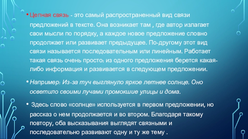 Она возникает там , где автор излагает свои мысли по порядку, а каждое новое предложение словно продолжает или развивает предыдущее. По-другому этот вид связи называется последовательным или линейным. Работает такая связь очень просто: из одного предложения берется какая-либо информация и развивается в следующем предложении.