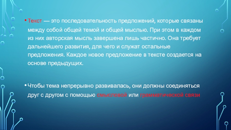 Слайд 2Текст — это последовательность предложений, которые связаны между собой общей темой