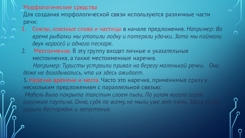 3. Наречия времени и места. Часто это наречия, применимые сразу к нескольким предложениям с параллельной связью: