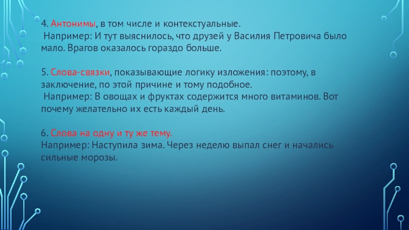 5. Слова-связки, показывающие логику изложения: поэтому, в заключение, по этой причине и тому подобное.