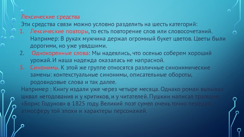 Рассмотрим основные способы и средства связи между предложениями в тексте.