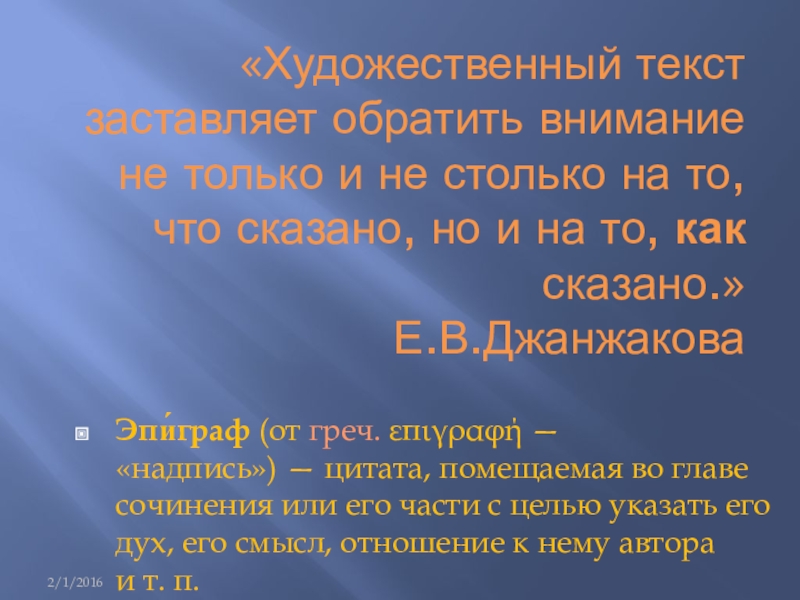 Эпи́граф (от греч. επιγραφή — «надпись») — цитата, помещаемая во главе сочинения или его части с целью указать его дух, его смысл, отношение к нему автора и т. п.