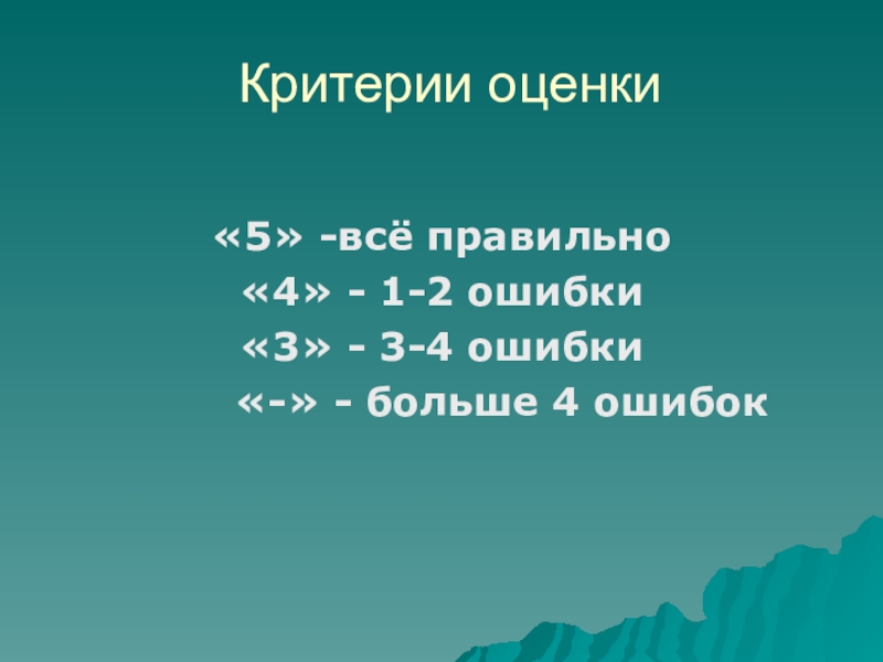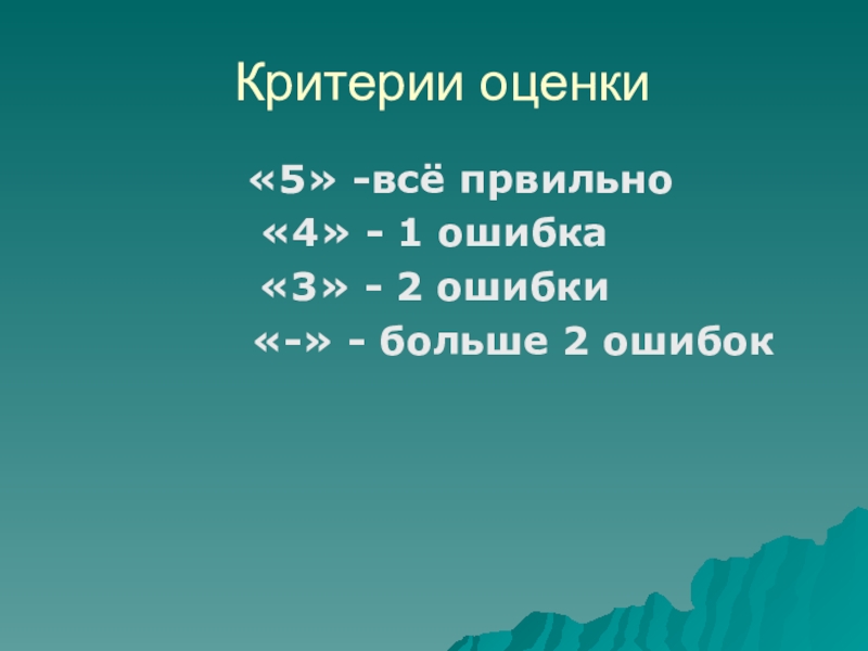 Критерии оценки  «5» -всё првильно «4» - 1 ошибка«3» - 2 ошибки