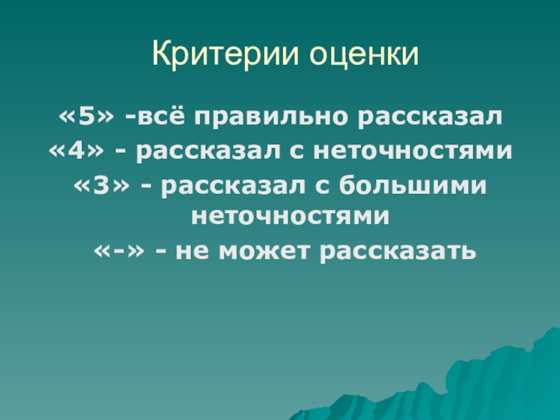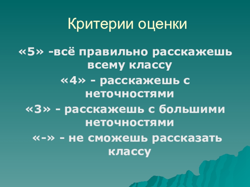 Критерии оценки«5» -всё правильно расскажешь всему классу «4» - расскажешь с неточностями«3» - расскажешь с большими неточностями