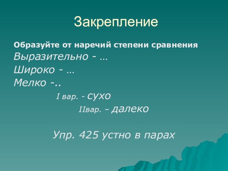ЗакреплениеОбразуйте от наречий степени сравненияВыразительно - …Широко - …Мелко -..