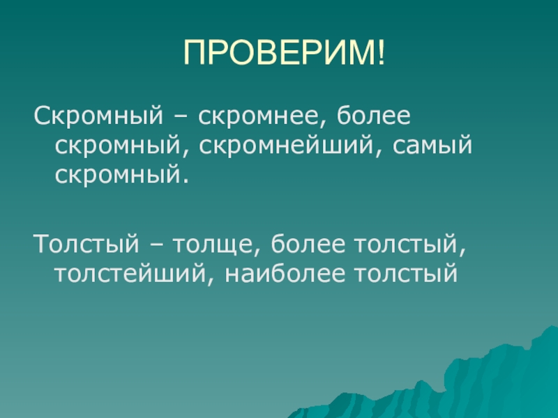 ПРОВЕРИМ!Скромный – скромнее, более скромный, скромнейший, самый скромный.Толстый – толще, более толстый, толстейший, наиболее толстый