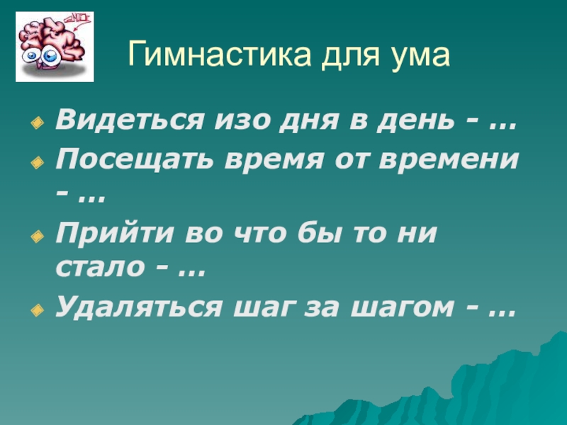 Гимнастика для умаВидеться изо дня в день - …Посещать время от времени - …Прийти во что бы