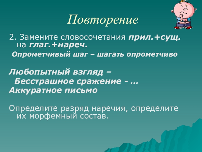 Повторение2. Замените словосочетания прил.+сущ. на глаг.+нареч. Опрометчивый шаг – шагать опрометчиво Любопытный взгляд –  Бесстрашное сражение
