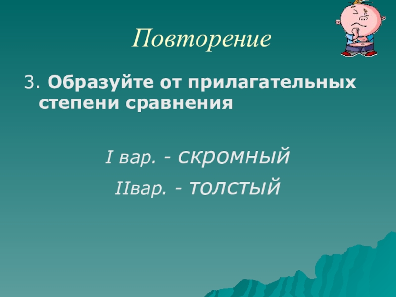 Повторение3. Образуйте от прилагательных степени сравненияI вар. - скромныйIIвар. - толстый