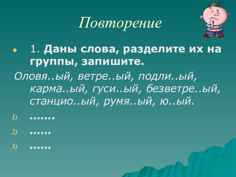 Повторение1. Даны слова, разделите их на группы, запишите.Оловя..ый, ветре..ый, подли..ый, карма..ый, гуси..ый, безветре..ый, станцио..ый, румя..ый, ю..ый.…….…………