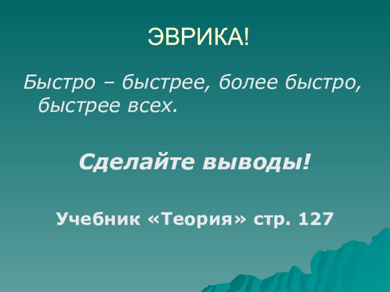 ЭВРИКА!Быстро – быстрее, более быстро, быстрее всех.Сделайте выводы!Учебник «Теория» стр. 127