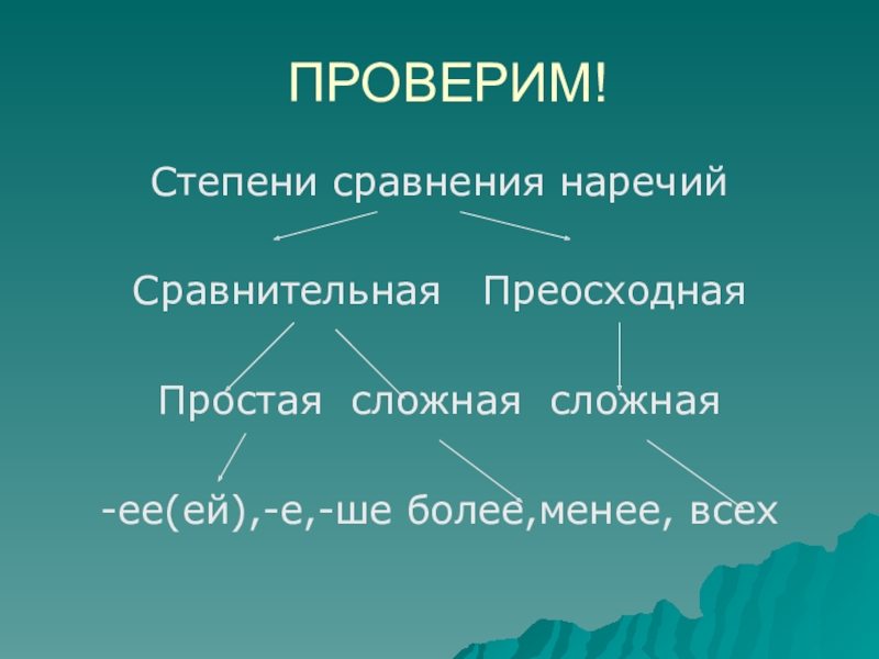 ПРОВЕРИМ!Степени сравнения наречийСравнительная  ПреосходнаяПростая сложная сложная-ее(ей),-е,-ше более,менее, всех