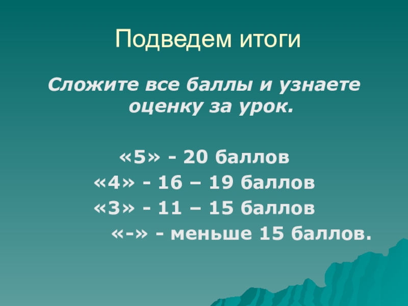 Сложите все баллы и узнаете оценку за урок.