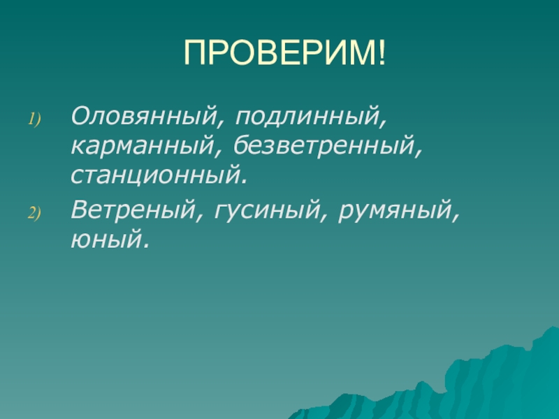 ПРОВЕРИМ!Оловянный, подлинный, карманный, безветренный, станционный.Ветреный, гусиный, румяный, юный.