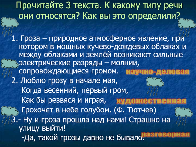 1. Гроза – природное атмосферное явление, при котором в мощных кучево-дождевых облаках и между облаками и землёй возникают сильные электрические разряды – молнии, сопровождающиеся громом.