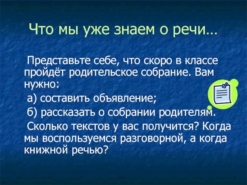 Задача речи – сообщение.