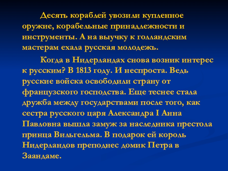 Когда в Нидерландах снова возник интерес к русским? В 1813 году. И неспроста. Ведь русские войска освободили страну от французского господства. Еще теснее стала дружба между государствами после того, как сестра русского царя Александра I Анна Павловна вышла замуж за наследника престола принца Вильгельма. В подарок ей король Нидерландов преподнес домик Петра в Заандаме.