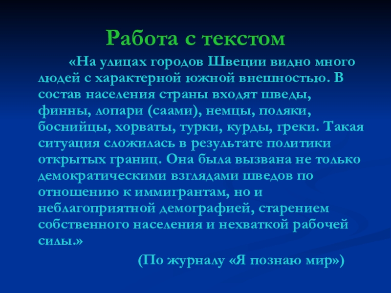 Швеции видно много людей с характерной южной внешностью. В состав населения страны входят шведы, финны, лопари (саами), немцы, поляки, боснийцы, хорваты, турки, курды, греки. Такая ситуация сложилась в результате политики открытых границ. Она была вызвана не только демократическими взглядами шведов по отношению к иммигрантам, но и неблагоприятной демографией, старением собственного населения и нехваткой рабочей силы.»