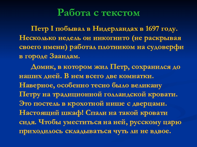 Домик, в котором жил Петр, сохранился до наших дней. В нем всего две комнатки. Наверное, особенно тесно было великану Петру на традиционной голландской кровати. Это постель в крохотной нише с дверцами. Настоящий шкаф! Спали на такой кровати сидя. Чтобы уместиться на ней, русскому царю приходилось складываться чуть ли не вдвое.