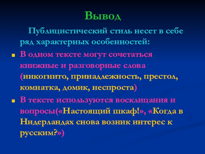 В одном тексте могут сочетаться книжные и разговорные слова (инкогнито, принадлежность, престол, комнатка, домик, неспроста)