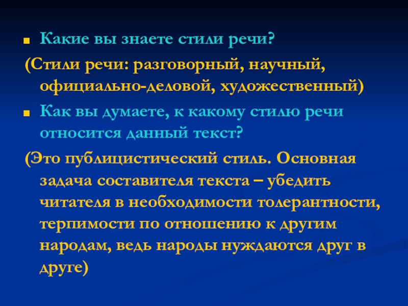(Это публицистический стиль. Основная задача составителя текста – убедить читателя в необходимости толерантности, терпимости по отношению к другим народам, ведь народы нуждаются друг в друге)