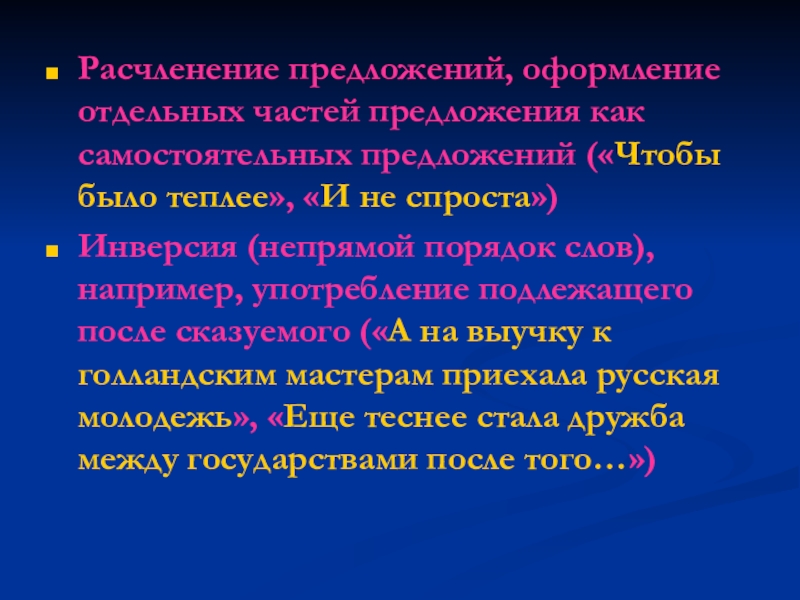 Инверсия (непрямой порядок слов), например, употребление подлежащего после сказуемого («А на выучку к голландским мастерам приехала русская молодежь», «Еще теснее стала дружба между государствами после того…»)