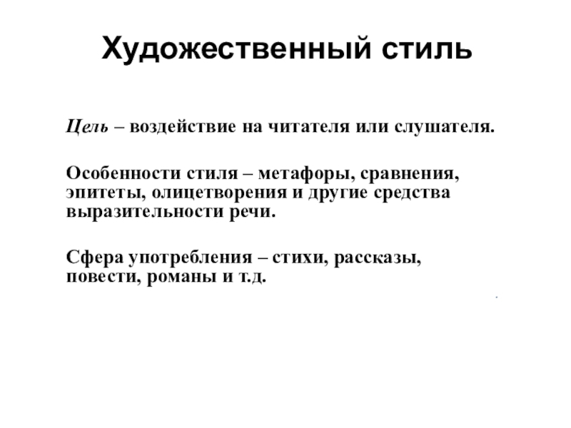 Художественный стильЦель – воздействие на читателя или слушателя.Особенности стиля – метафоры, сравнения, эпитеты, олицетворения и другие средства