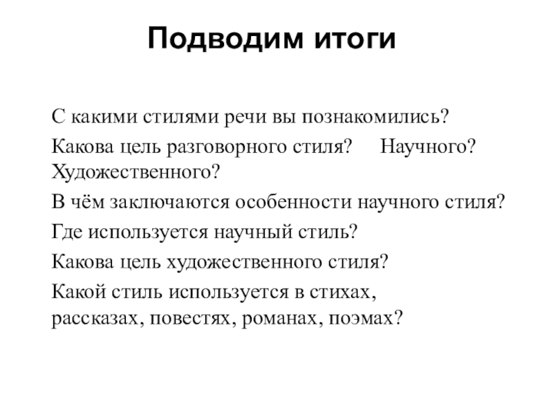Подводим итогиС какими стилями речи вы познакомились?Какова цель разговорного стиля?   Научного? Художественного?В чём заключаются особенности