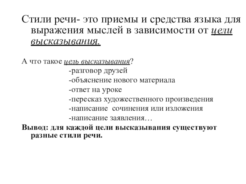 Вывод: для каждой цели высказывания существуют разные стили речи.
