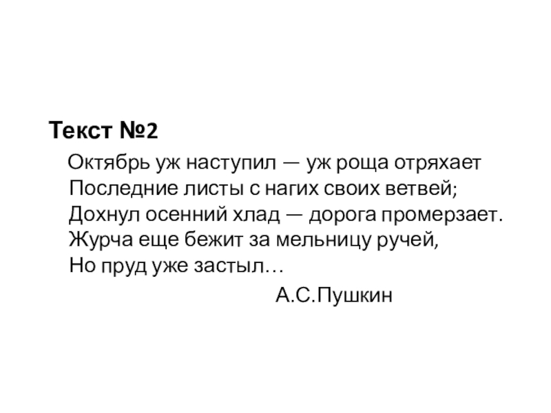 Текст №2  Октябрь уж наступил — уж роща отряхает  Последние листы с нагих своих ветвей;  Дохнул