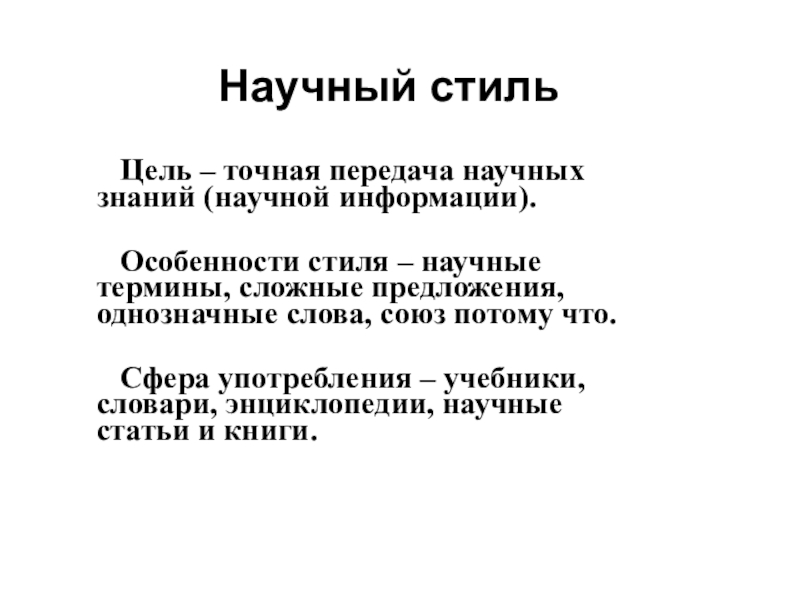 Научный стиль  Цель – точная передача научных знаний (научной информации).  Особенности стиля – научные термины,