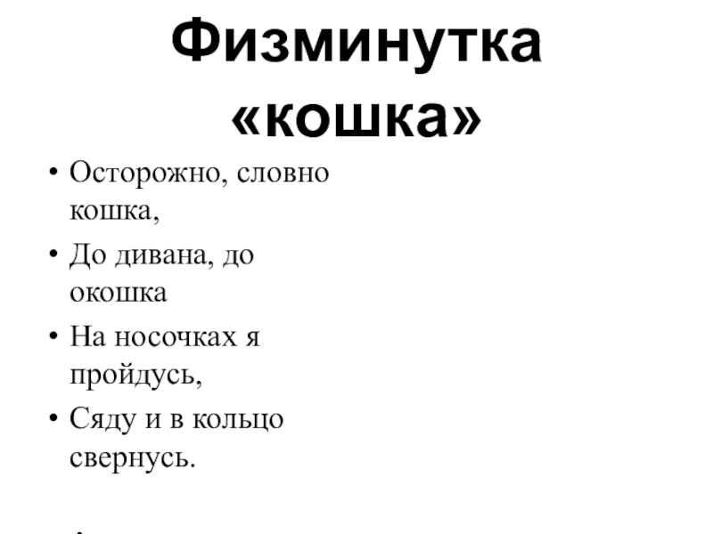 Физминутка «кошка» Осторожно, словно кошка,До дивана, до окошкаНа носочках я пройдусь, Сяду и в кольцо свернусь.А теперь