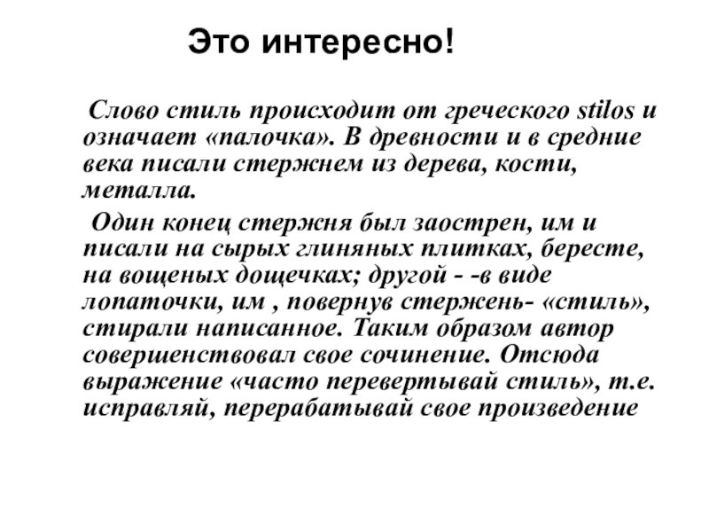 Это интересно!   Слово стиль происходит от греческого stilos и означает «палочка». В древности и в