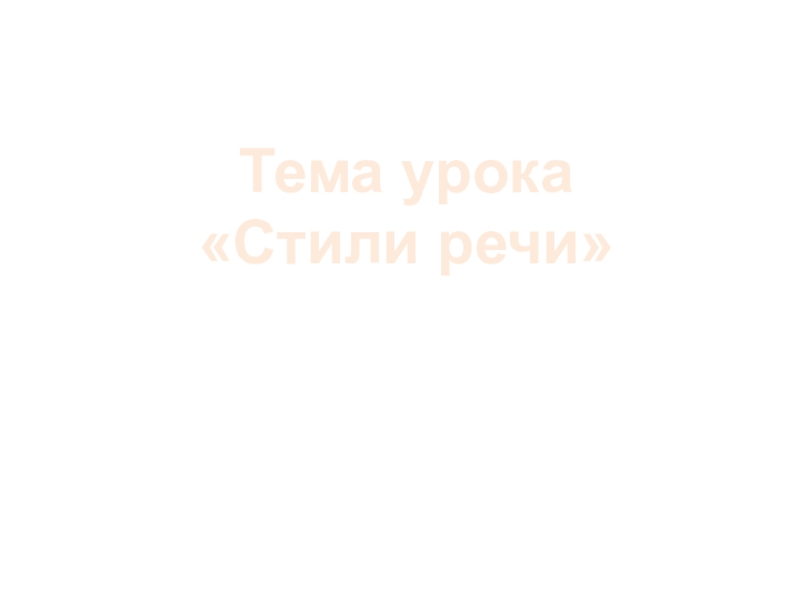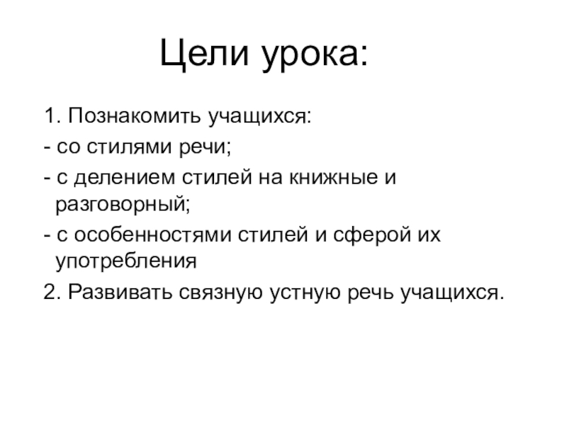 Цели урока:1. Познакомить учащихся:- со стилями речи;- с делением стилей на книжные и разговорный;- с особенностями стилей