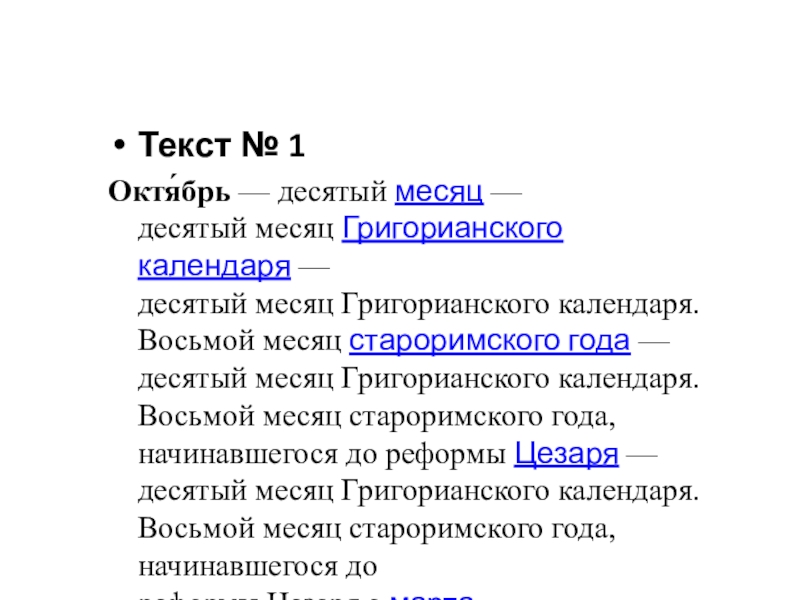 Текст № 1Октя́брь — десятый месяц — десятый месяц Григорианского календаря — десятый месяц Григорианского календаря. Восьмой месяц староримского года — десятый месяц Григорианского календаря. Восьмой месяц староримского года, начинавшегося