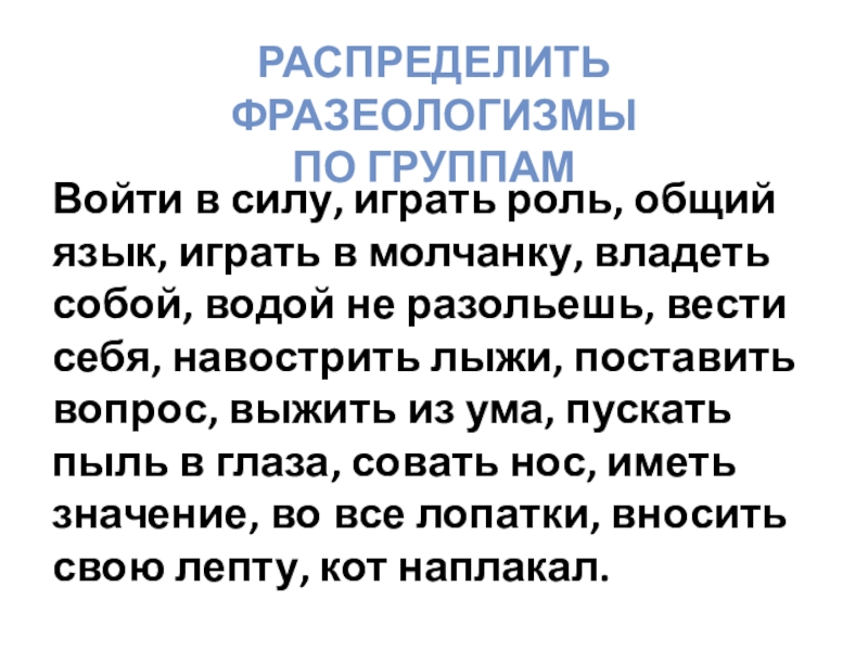 Слайд 3Распределить фразеологизмы по группам