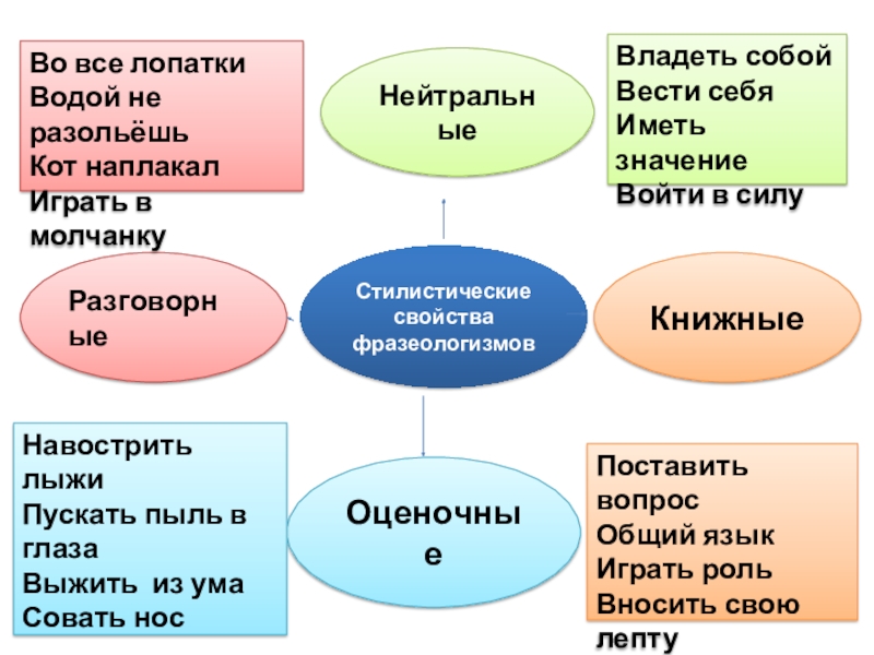 Стилистические свойства фразеологизмовНейтральныеКнижныеОценочныеРазговорныеВладеть собойВести себяИметь значениеВойти в силуПоставить вопросОбщий языкИграть роль Вносить свою лептуНавострить лыжиПускать пыль в