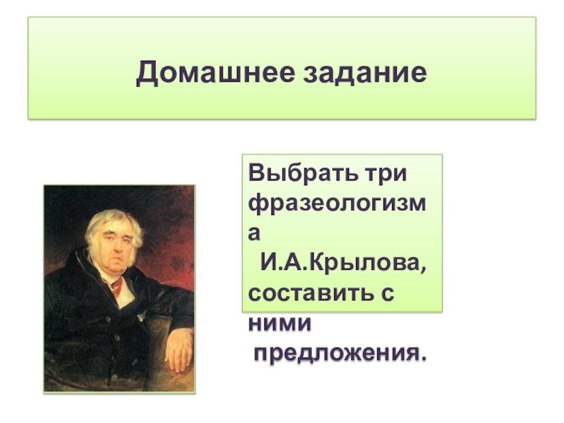 Домашнее задание   Выбрать три фразеологизма И.А.Крылова, составить с ними предложения.