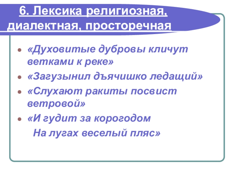 6. Лексика религиозная, 	диалектная, просторечная«Духовитые дубровы кличут ветками к реке»«Загузынил дъячишко ледащий»«Слухают ракиты посвист ветровой»«И гудит за