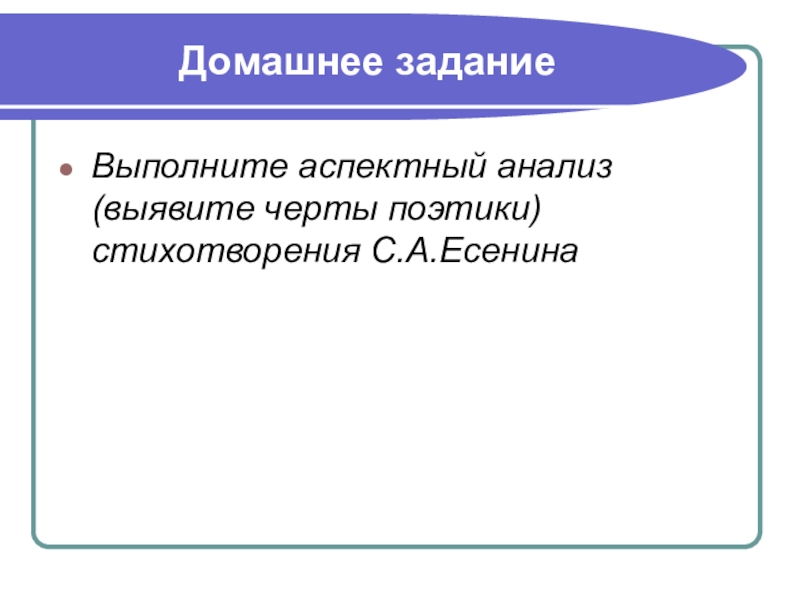 Домашнее заданиеВыполните аспектный анализ (выявите черты поэтики) стихотворения С.А.Есенина