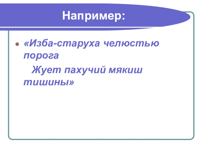 Например:«Изба-старуха челюстью порога	 Жует пахучий мякиш тишины»