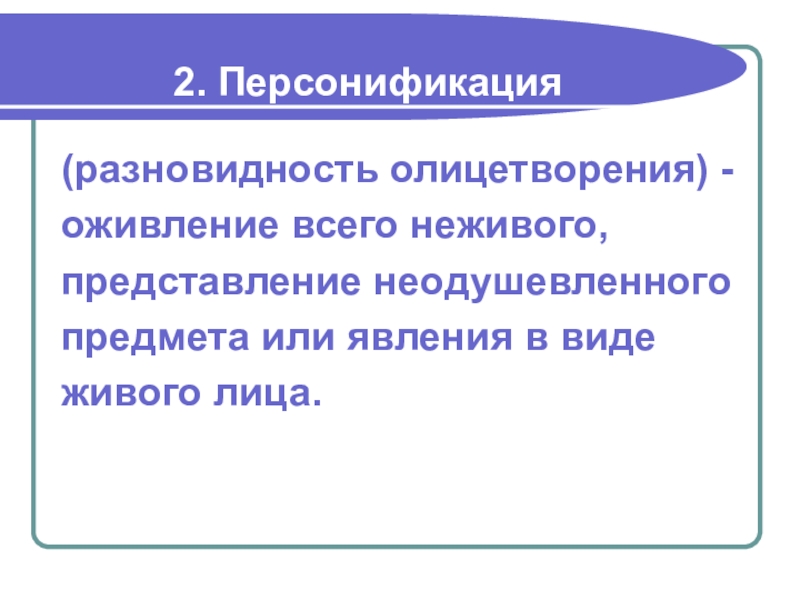 2. Персонификация(разновидность олицетворения) -оживление всего неживого,представление неодушевленногопредмета или явления в видеживого лица.