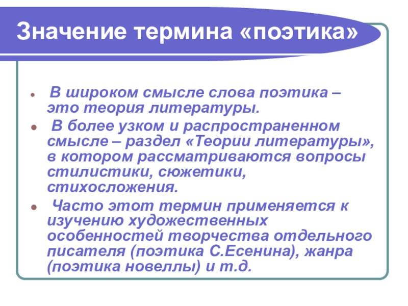 Значение термина «поэтика» В широком смысле слова поэтика – это теория литературы. В более узком и распространенном