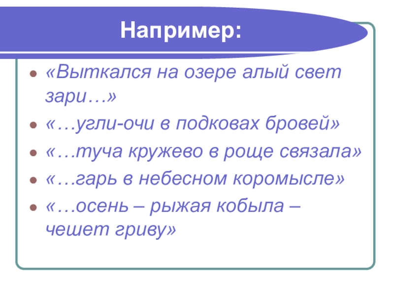 Например:«Выткался на озере алый свет зари…»«…угли-очи в подковах бровей»«…туча кружево в роще связала»«…гарь в небесном коромысле» «…осень