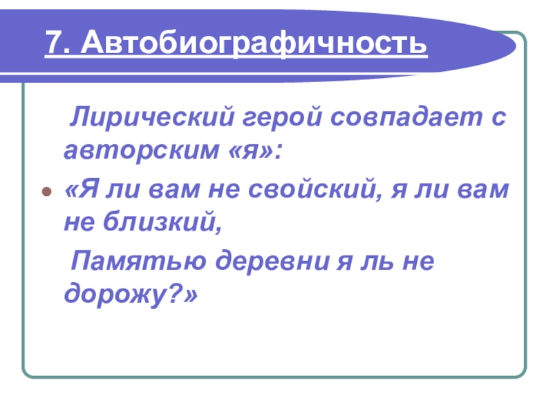 7. Автобиографичность	Лирический герой совпадает с авторским «я»:«Я ли вам не свойский, я ли вам не близкий,	Памятью деревни