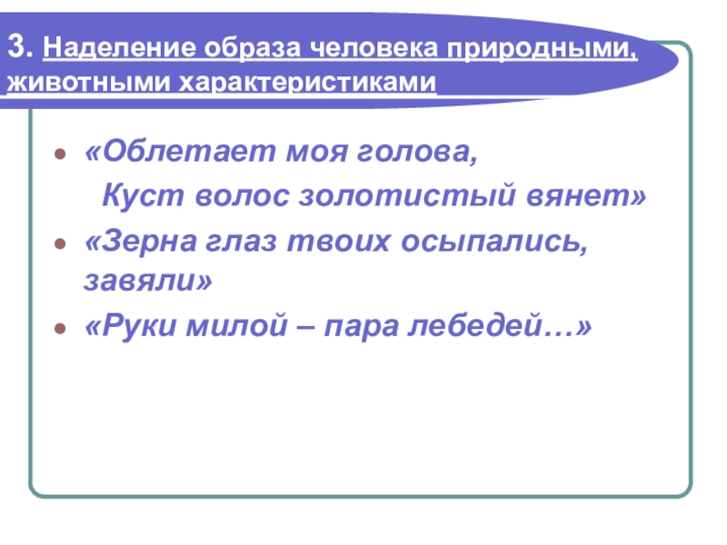 3. Наделение образа человека природными, 	животными характеристиками«Облетает моя голова, 	 Куст волос золотистый вянет»«Зерна глаз твоих осыпались,