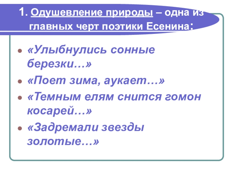 1. Одушевление природы – одна из главных черт поэтики Есенина:«Улыбнулись сонные березки…»«Поет зима, аукает…»«Темным елям снится гомон