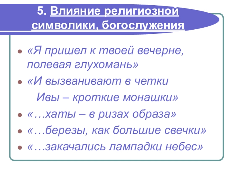5. Влияние религиозной символики, богослужения«Я пришел к твоей вечерне, полевая глухомань»«И вызванивают в четки 	 Ивы –