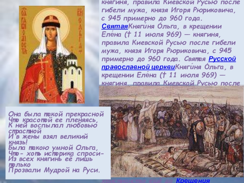 в крещении Еле́на († 11 июля 969Княги́ня О́льга, в крещении Еле́на († 11 июля 969) — княгиняКняги́ня О́льга, в крещении Еле́на († 11 июля 969) — княгиня, правила Киевской РусьюКняги́ня О́льга, в крещении Еле́на († 11 июля 969) — княгиня, правила Киевской Русью после гибели мужа, князя Игоря РюриковичаКняги́ня О́льга, в крещении Еле́на († 11 июля 969) — княгиня, правила Киевской Русью после гибели мужа, князя Игоря Рюриковича, с 945Княги́ня О́льга, в крещении Еле́на († 11 июля 969) — княгиня, правила Киевской Русью после гибели мужа, князя Игоря Рюриковича, с 945 примерно до 960 годаКняги́ня О́льга, в крещении Еле́на († 11 июля 969) — княгиня, правила Киевской Русью после гибели мужа, князя Игоря Рюриковича, с 945 примерно до 960 года. СвятаяКняги́ня О́льга, в крещении Еле́на († 11 июля 969) — княгиня, правила Киевской Русью после гибели мужа, князя Игоря Рюриковича, с 945 примерно до 960 года. Святая Русской православной церквиКняги́ня О́льга, в крещении Еле́на († 11 июля 969) — княгиня, правила Киевской Русью после гибели мужа, князя Игоря Рюриковича, с 945 примерно до 960 года. Святая Русской православной церкви, первая из русских правителей приняла христианствоКняги́ня О́льга, в крещении Еле́на († 11 июля 969) — княгиня, правила Киевской Русью после гибели мужа, князя Игоря Рюриковича, с 945 примерно до 960 года. Святая Русской православной церкви, первая из русских правителей приняла христианство ещё до Крещения РусиКняги́ня О́льга, в крещении Еле́на († 11 июля 969) — княгиня, правила Киевской Русью после гибели мужа, князя Игоря Рюриковича, с 945 примерно до 960 года. Святая Русской православной церкви, первая из русских правителей приняла христианство ещё до Крещения Руси. Первая русская святая.